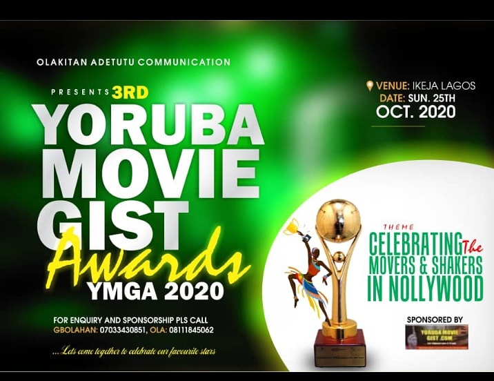 The 2020 edition of the Yoruba Movie Gist Awards {YMGA}, organized by Olakiitan Adetutu Communications, will hold in Lagos on Sunday October 25th 2020.