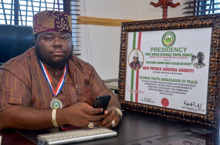 Prince Adesina Adebiyi, chairman of Unique Motors, has been awarded the ECOWAS Youth Ambassador of Peace. This happened on Wednesday, September 2, 2020. However, images confirming his award spilled onto Unique Motors’s Instagram page on Friday, September 4, 2020, where Prince Adebiyi was spotted in a native attire, a medal of victory slung on his neck and a framed congratulatory message from the Presidency of ECOWAS held between his hands.