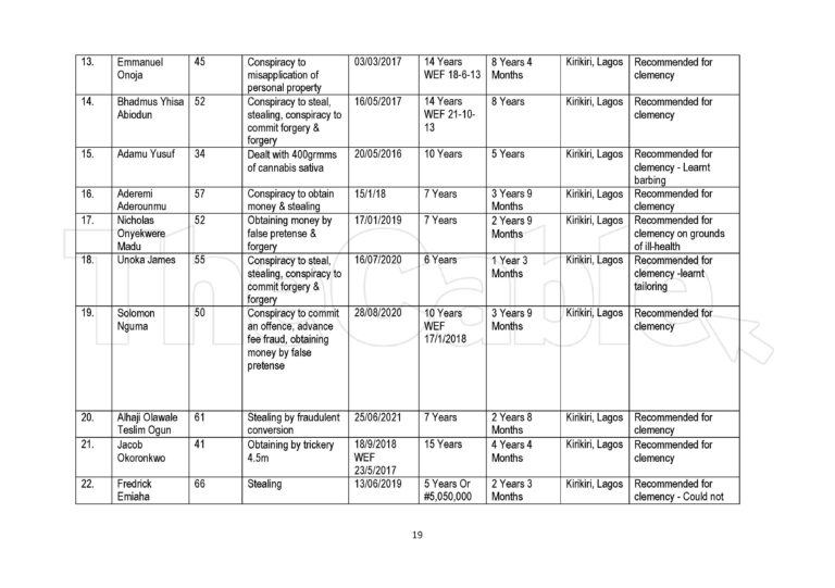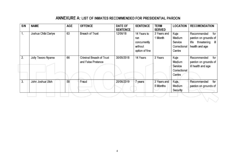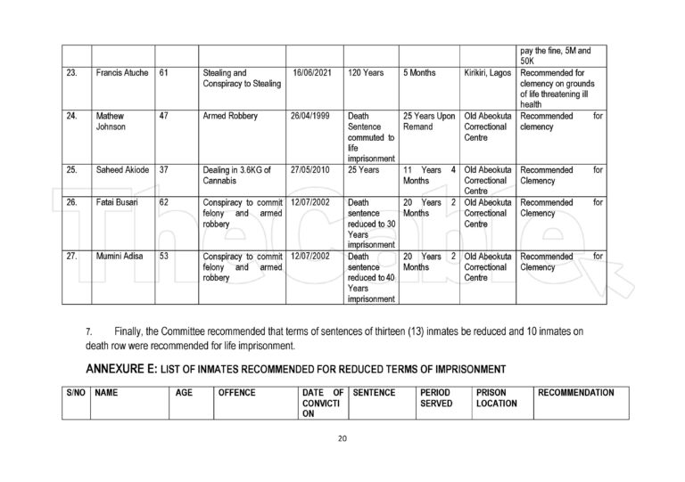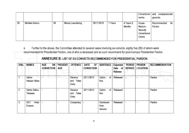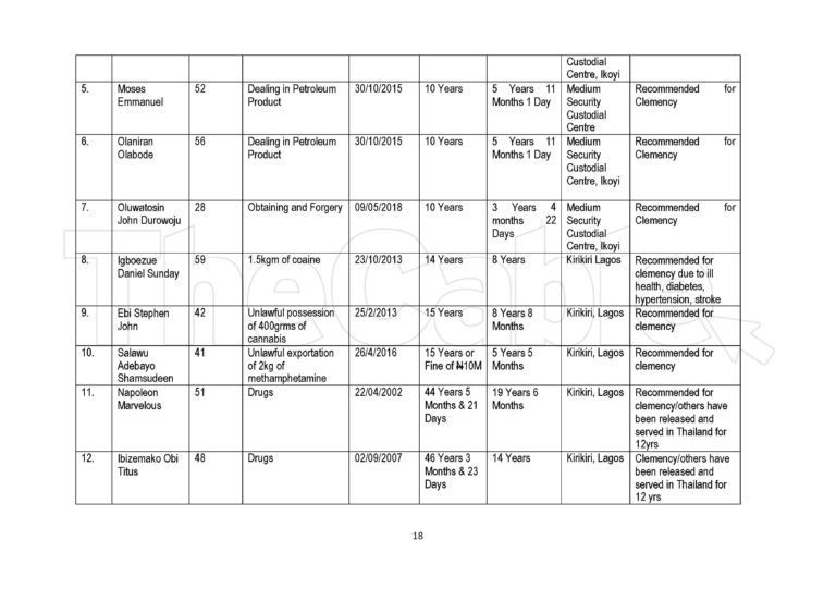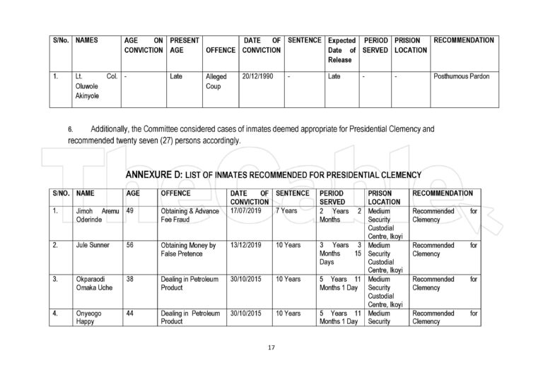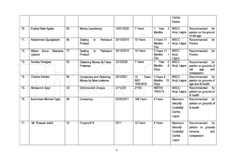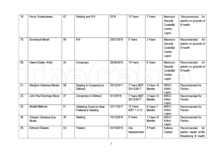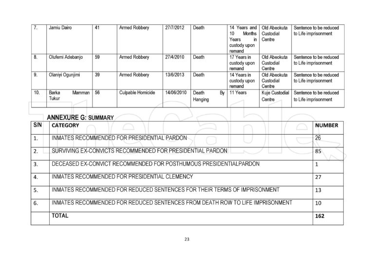 A list of the 162 convicts recommended for pardon by the Presidential Advisory Committee on Prerogative Of Mercy has emerged.