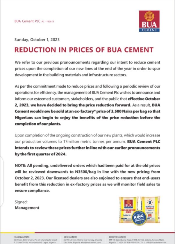 “As per the commitment made to reduce prices and following a periodic review of our operations for efficiency, the management of BUA Cement Plc wishes to announce and inform our esteemed customers, stakeholders, and the public that effective October 2, 2023, we have decided to bring the price reduction forward. As a result, BUA Cement would now be sold at an ex-factory price of 3,500 Naira per bag so that Nigerians can begin to enjoy the benefits of the price reduction before the completion of our plants.