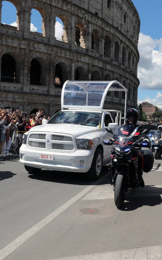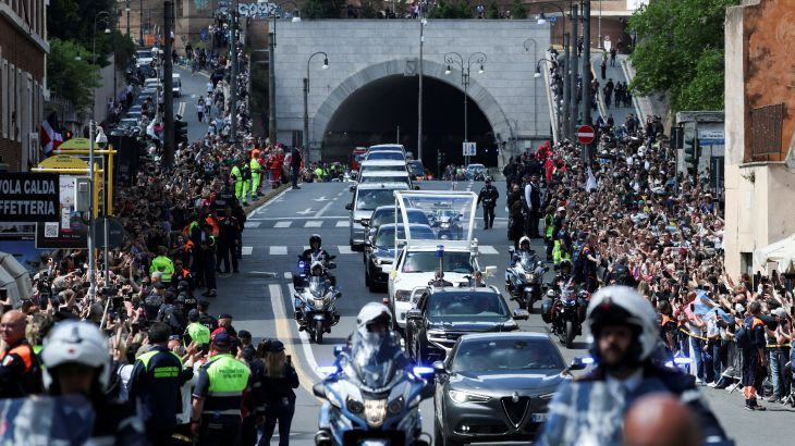 The popemobile-turned-hearse drove up to the Basilica of Saint Mary Major, where his coffin was raised towards the crowd for a final goodbye.