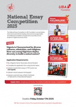 The deadline for submission of entries is Friday, October 17th, 2025, and applications can be accessed and submitted through the Foundation’s official website ubagroup.com/uba-foundation/national-essay-competition/, or by scanning the QR code available on the posters and websites.