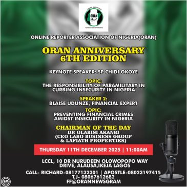 The Online Reporters Association of Nigeria (ORAN) is gearing up to celebrate its 6th anniversary in grand style, with a stellar lineup of speakers and guests. The event, scheduled for Thursday, December 11, 2025. promises to be a landmark occasion in the country’s media and security landscape.