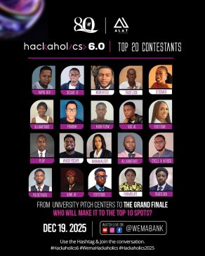 Following the 2-day pre-pitch for the grand finale, Wema Bank, Nigeria’s leading innovative bank and pioneer of Africa’s first fully digital bank, ALAT, has announced the Top 20 finalists for Hackaholics 6.0. The 2-day pre-pitch took place on December 16 and 17, 2025.