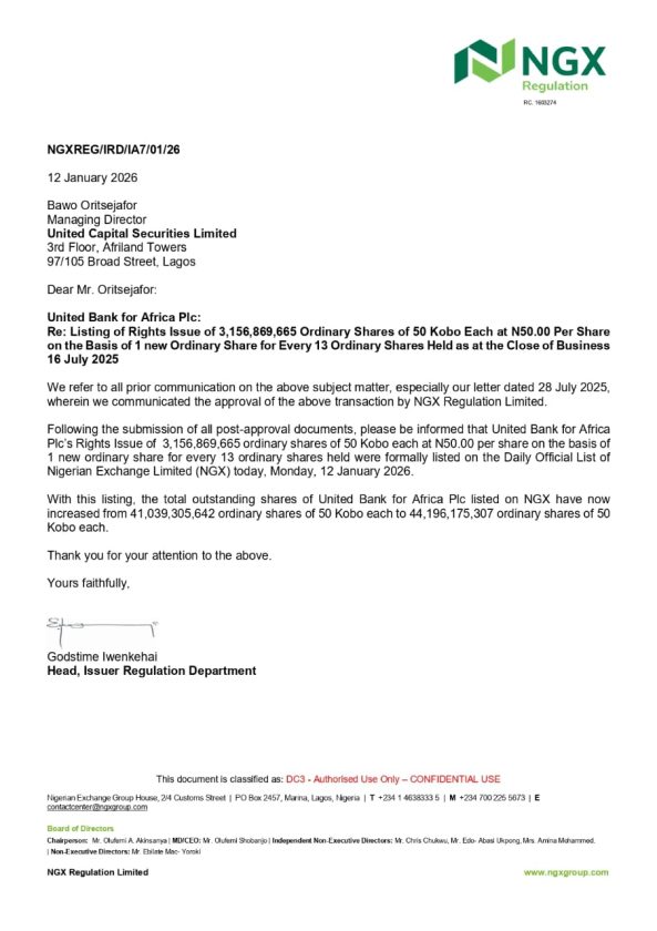 “Following the submission of all post-approval documents, please be informed that United Bank for Africa Plc’s Rights Issue of 3,156,869,665 ordinary shares of 50 Kobo each at N50.00 per share on the basis of one new ordinary share for every 13 ordinary shares held were formally listed on the Daily Official List of Nigerian Exchange Limited (NGX) on , Monday, 12 January 2026”, Iwenkehai stated in the letter.