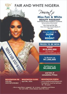 A press statement by Ingram Osigwe, Media Adviser to Fair and White Nigeria Ltd, owners of the Fair and White range of beauty products in Nigeria, indicates that the beauty pageantry is open to young, beautiful Nigerian ladies within the age range of 18 – 25 upon payment of a non- refundable fee of N20,000. According to Osigwe, registration closes April 8 , 2026.